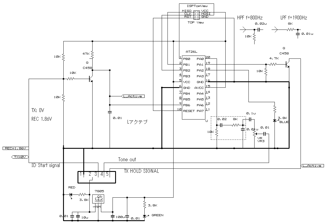 チップは毎度使いまわしているATtiny26Lで組む事にしました、前に車のバックメロデーで『おぼろ月夜』を演奏しようとBASCOMのサウンド命令を使ったら大変簡単だったので、今回もこれで組みました、単に方形波の連続で音を出していますので若干音が悪いです、そこでCRフィルタを入れてごまかしています、800HZから2KHZ前後のフルターとなるようにしました、実際にレピーターに取り付けると思いもよらないトラブルがある事が予想されますので、@基盤内部動作用の5Vの確認LEDAプログラムが正常動作時は点灯するLED を数個、動作確認に付けました、フィルタとかは簡単なWEBがありますので利用させて頂きました(感謝!)